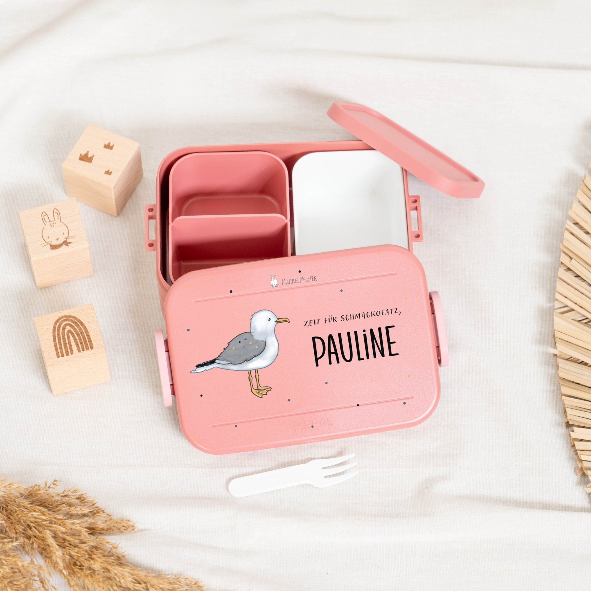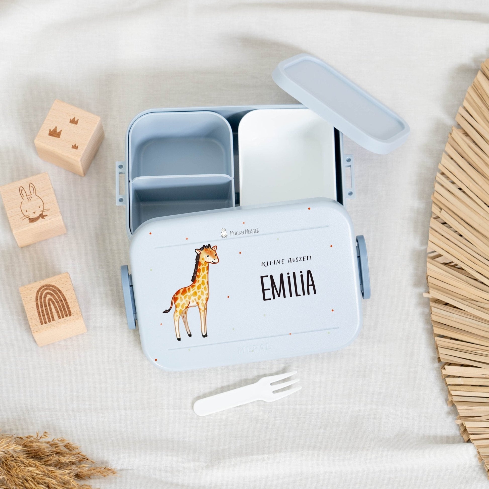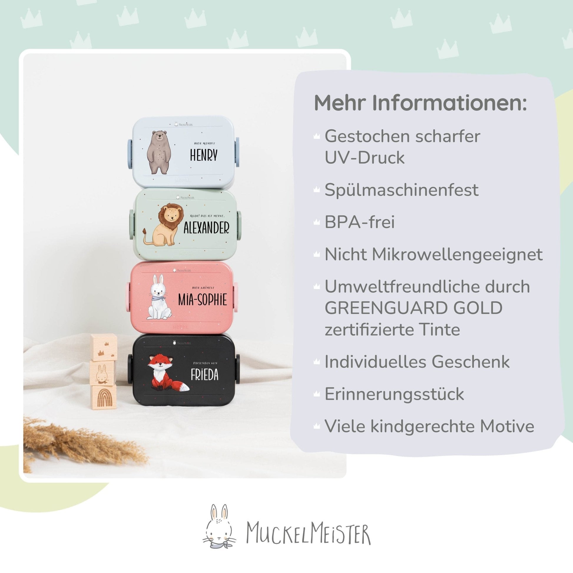 Mache die Brotdose einzigartig, indem du den Namen deines Kindes und eines von 16 niedlichen Muckelfreunde-Tieren auswählst. Diese persönliche Note verhindert Verwechslungen und macht die Brotdose zu einem besonderen Highlight.