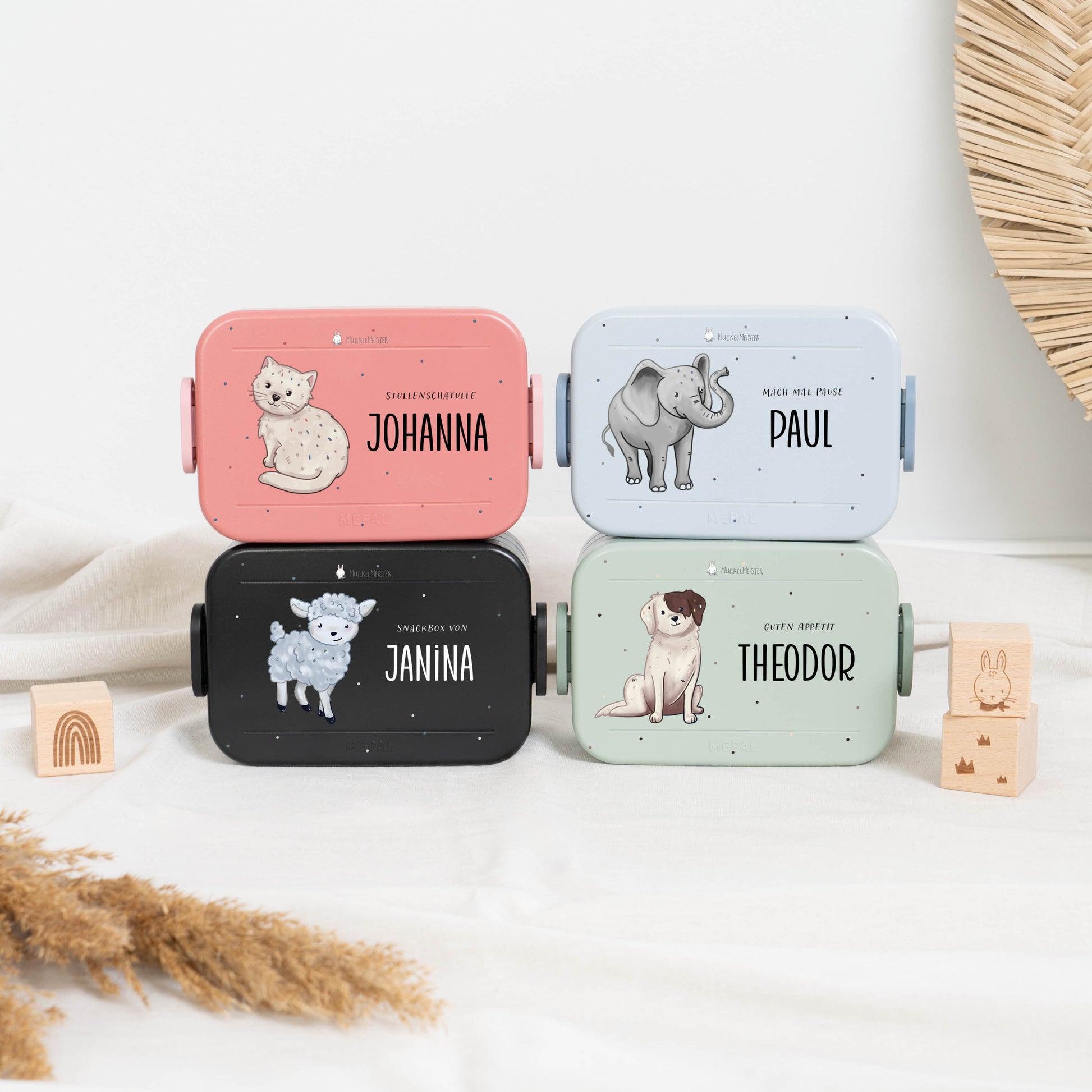 Wähle deine Lieblingsfarbe aus Nordic Sage, Vivid Mauve, Nordic Blue oder Nordic Black und personalisiere die Brotdose mit dem Namen und einem der niedlichen Muckelfreunde-Tiere. Mach das Pausenbrot zu einem Highlight und bestelle jetzt die personalisierte Mepal Brotdose für dein Kind!