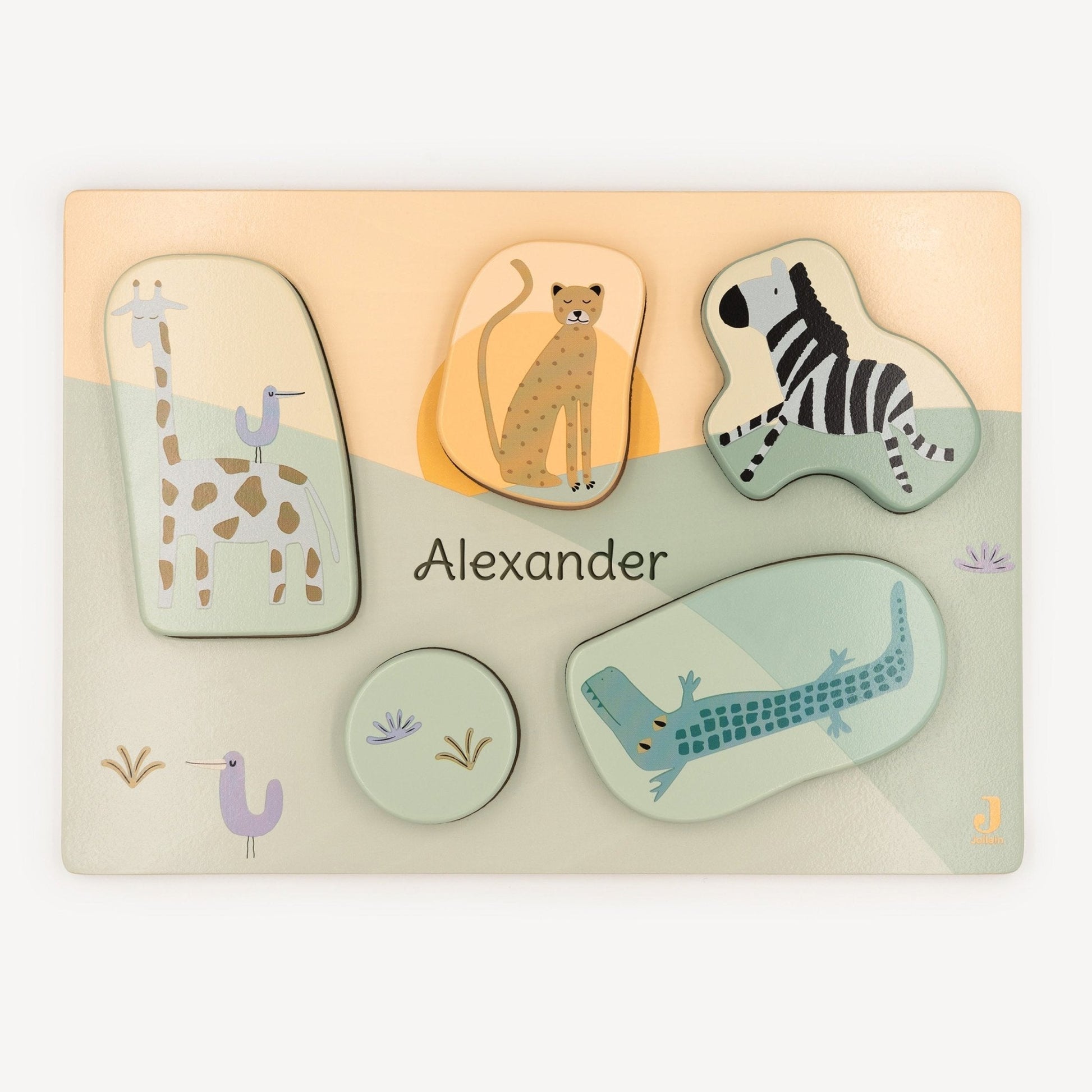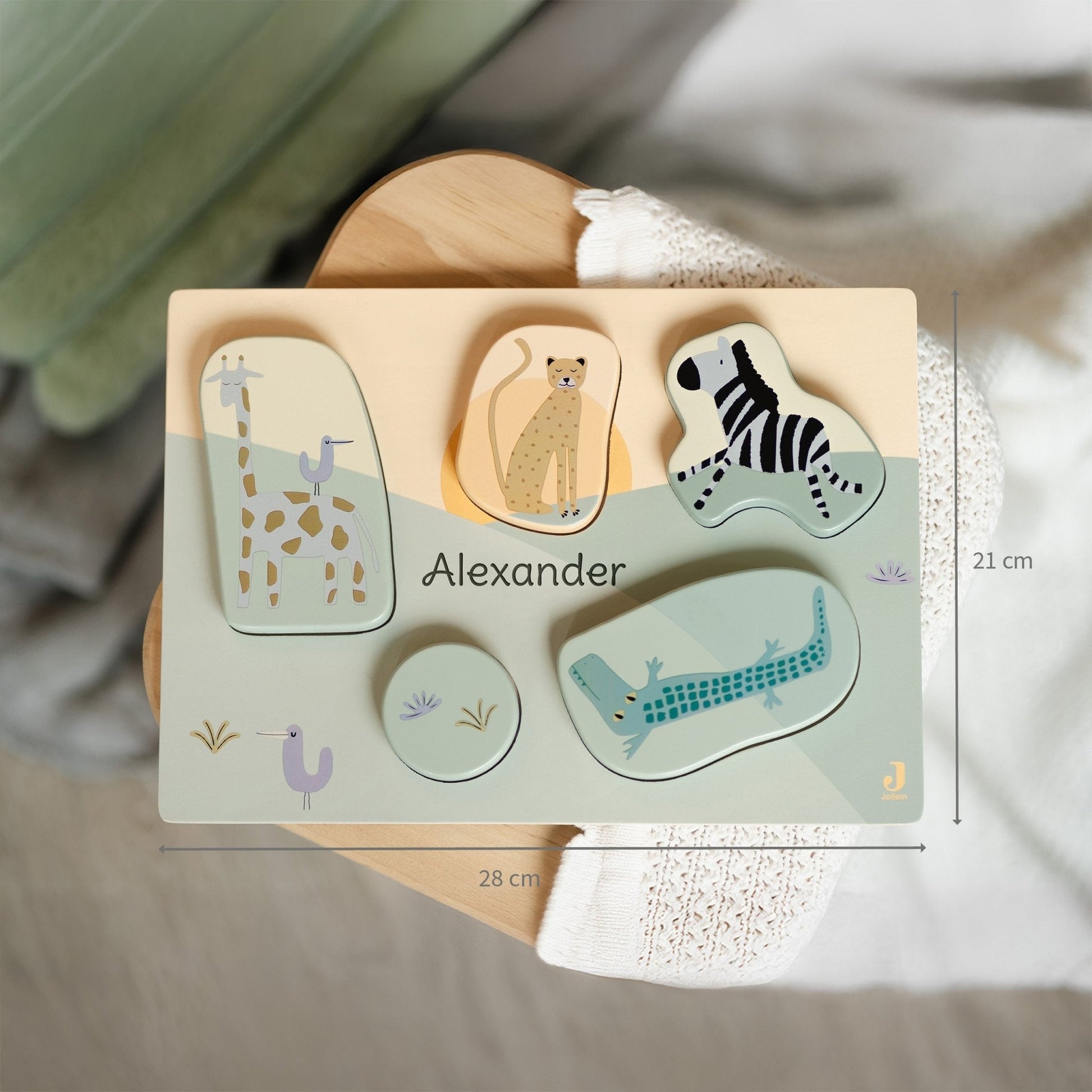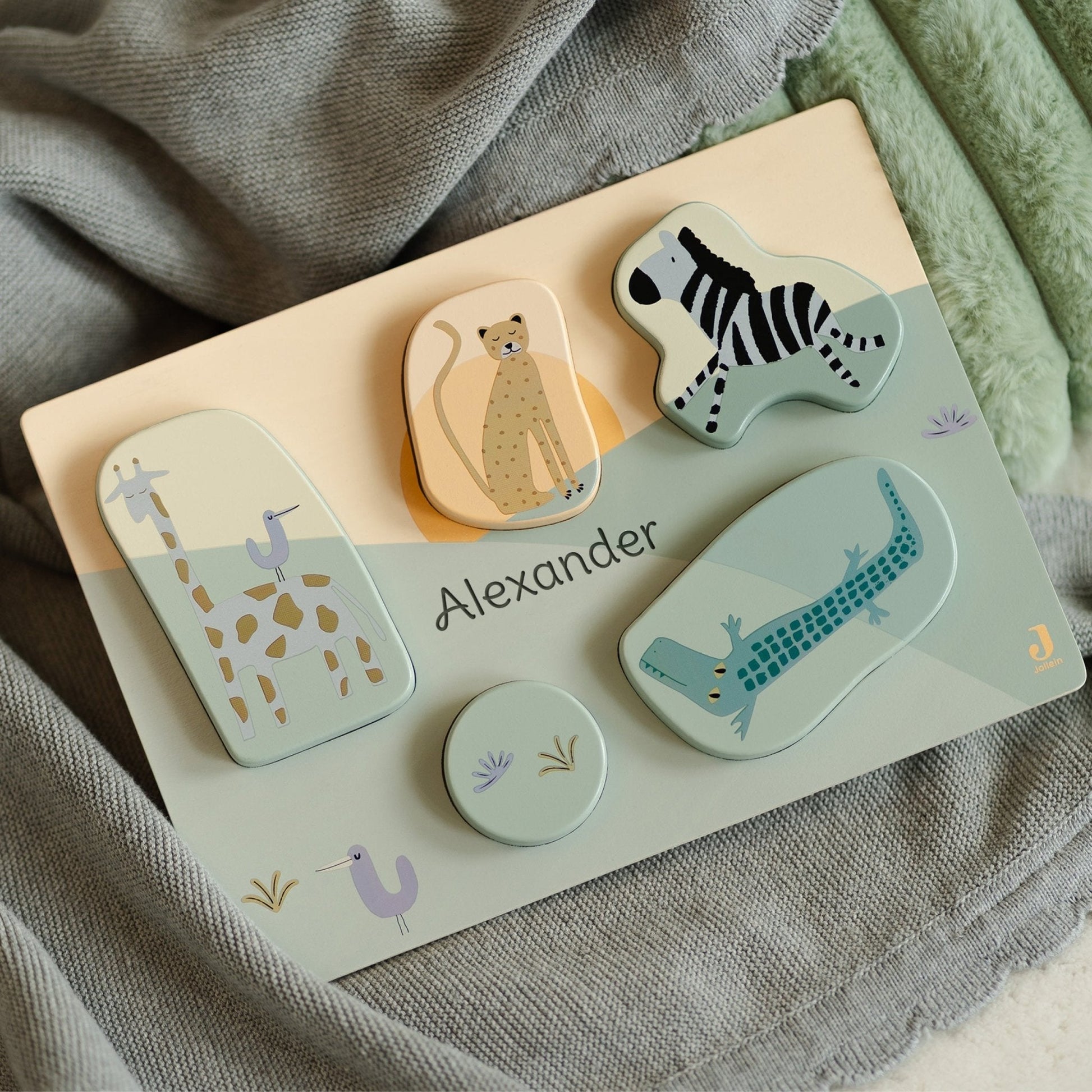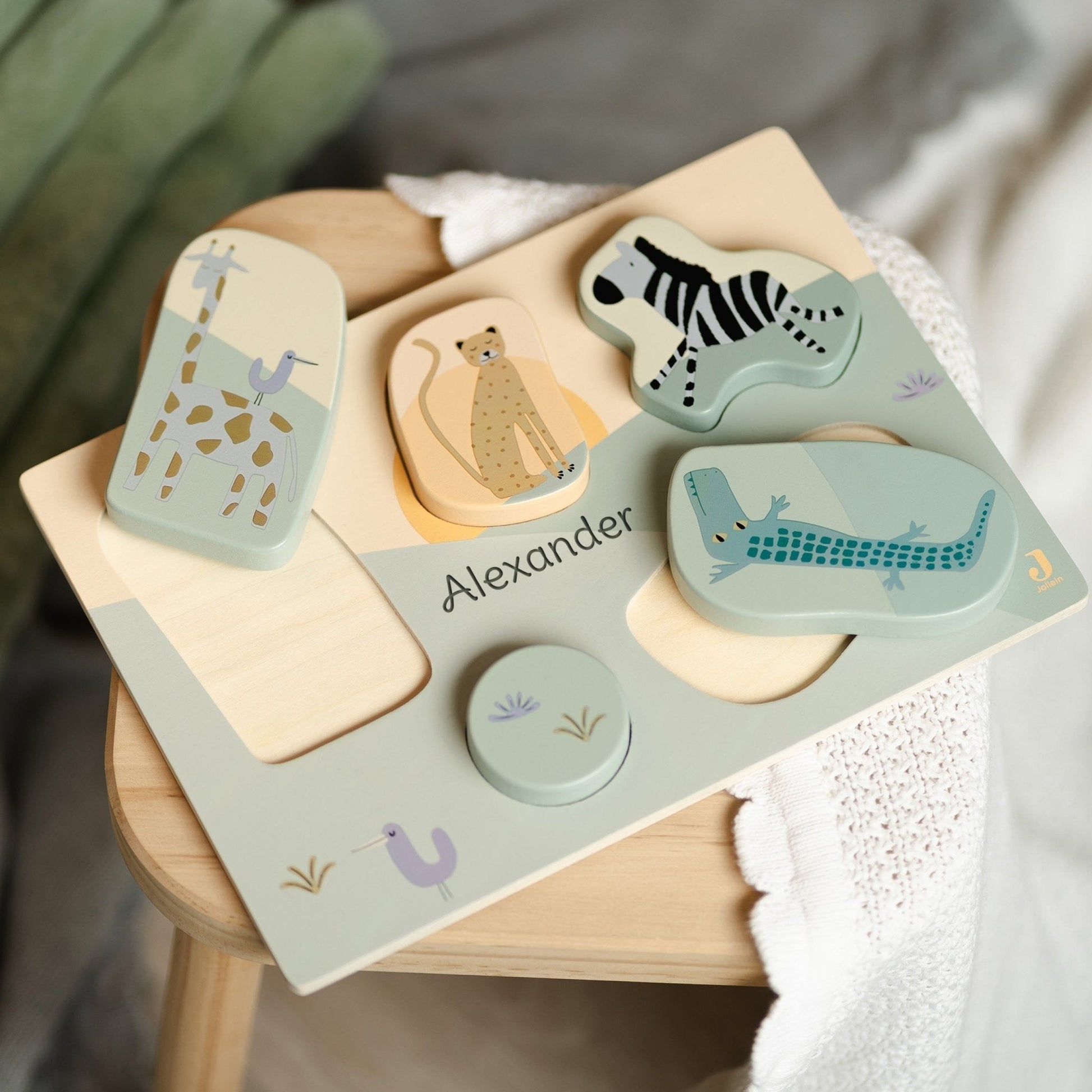 Dieses liebevoll gestaltete Holzpuzzle bringt Dschungel-Feeling direkt ins Kinderzimmer. Mit den handlichen Teilen können auch kleine Kinderhände spielerisch ihre Lieblings-Dschungeltiere entdecken – ganz ohne Frust, dafür mit ganz viel Freude am Ausprobieren.