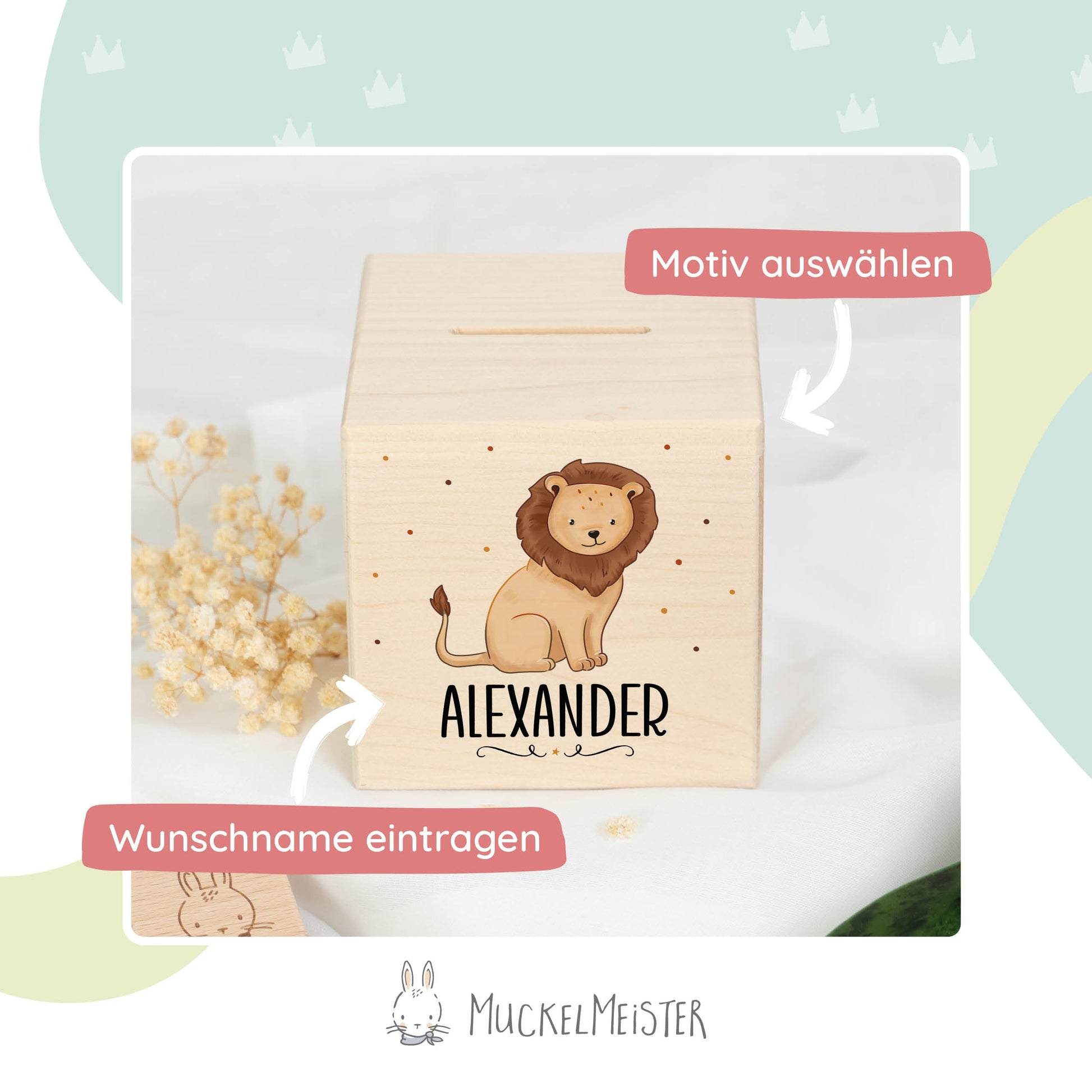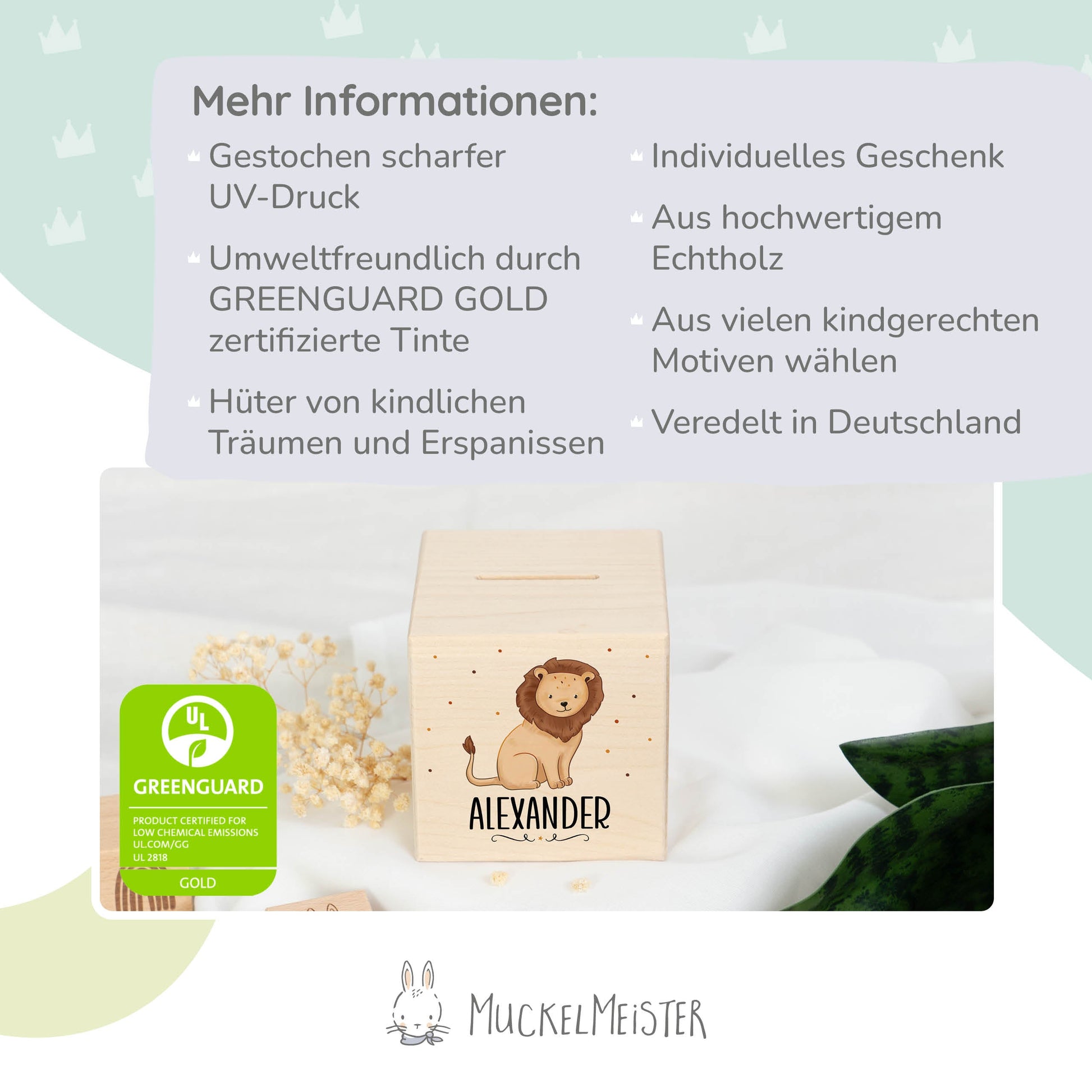 Die Spardosepersonalisiert aus Holz von Muckelmeister ist mehr als nur ein Ort, um das Taschengeld deines Kindes aufzubewahren – sie ist ein besonderes Erinnerungsstück, das die ersten Sparschritte deines Kindes begleitet. Diese hochwertige Spardose (10x10x10 cm) wird durch eine individuelle Gestaltung zu einem echten Unikat, das Freude und Erinnerungen schenkt.