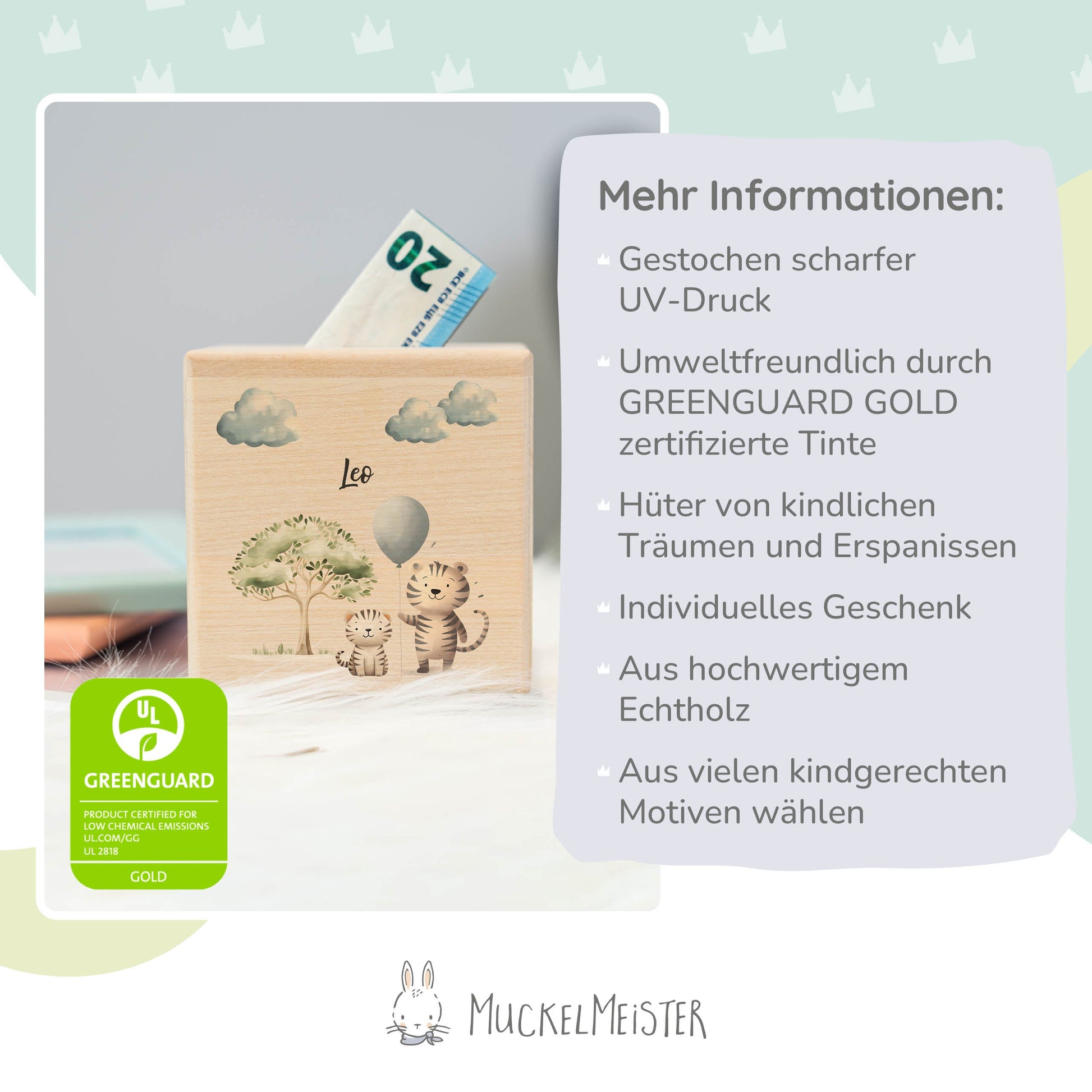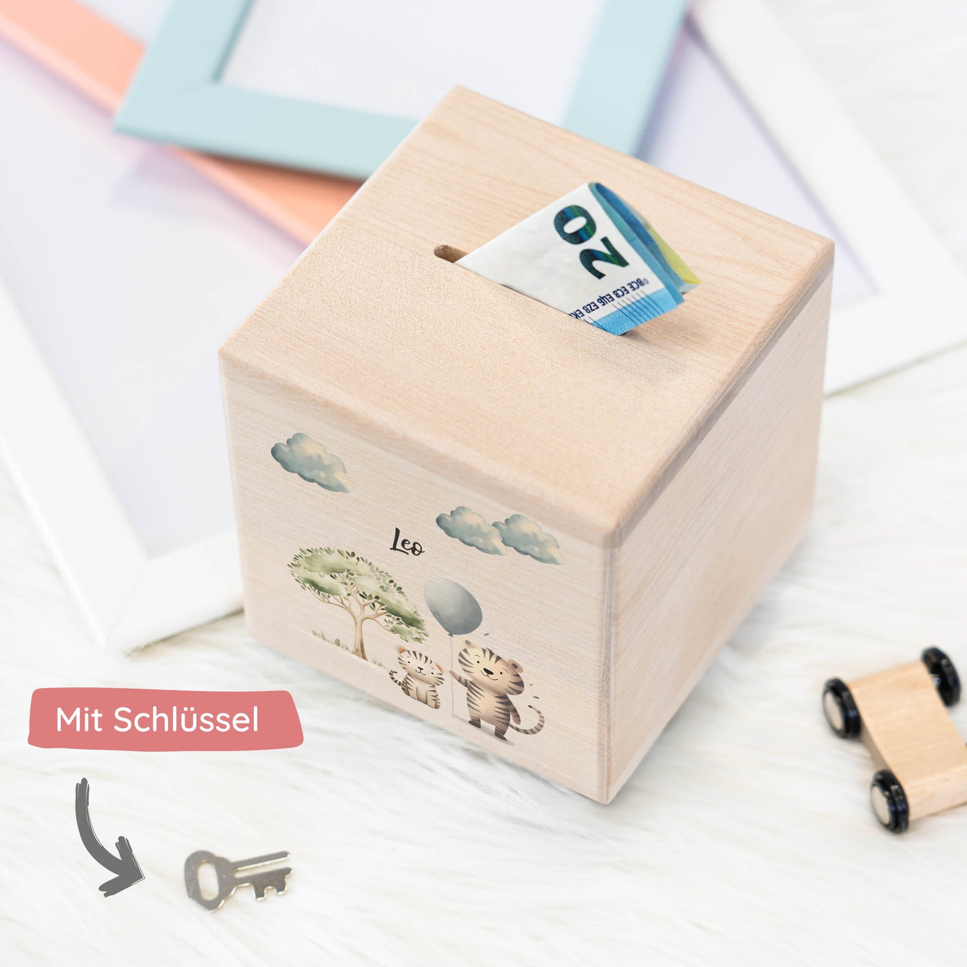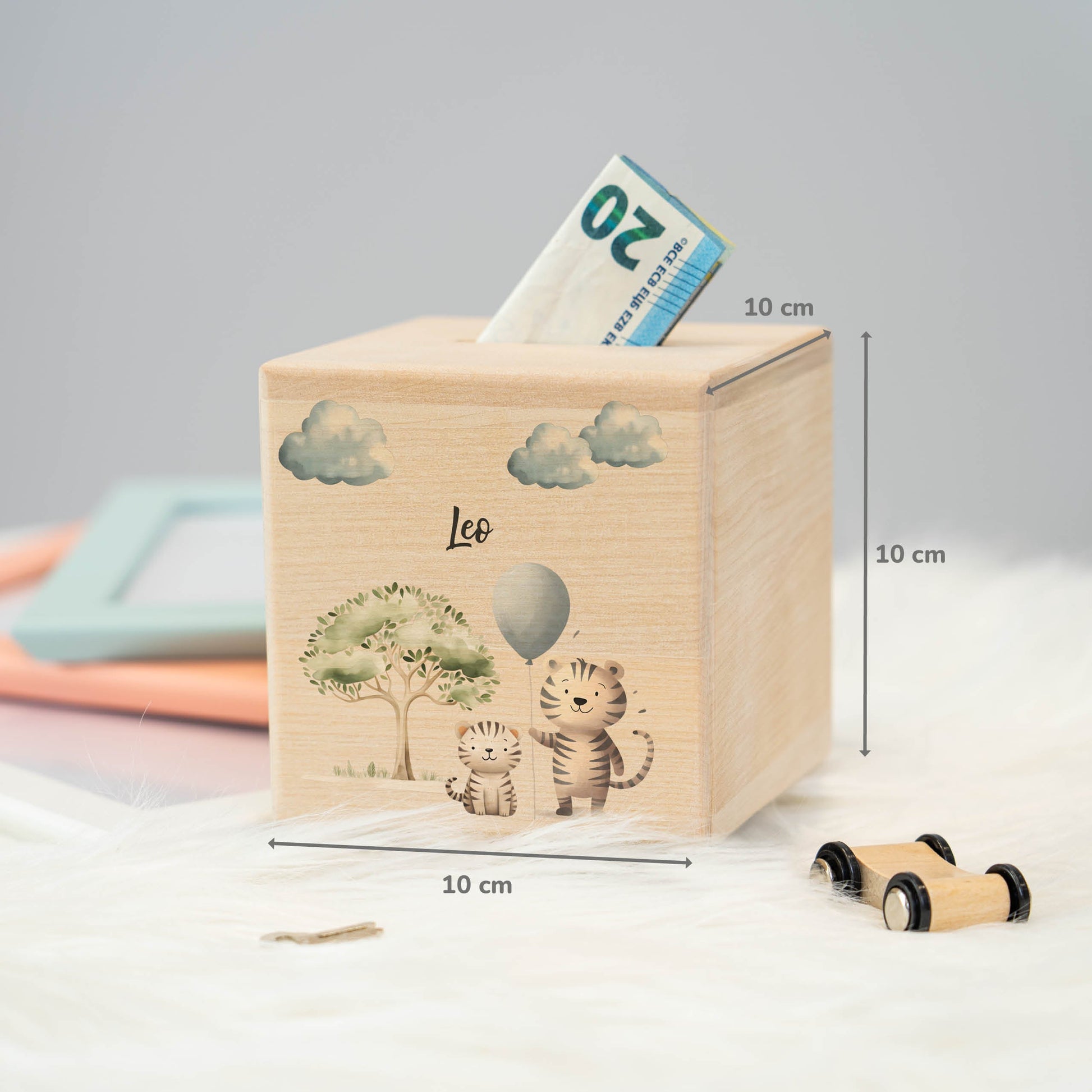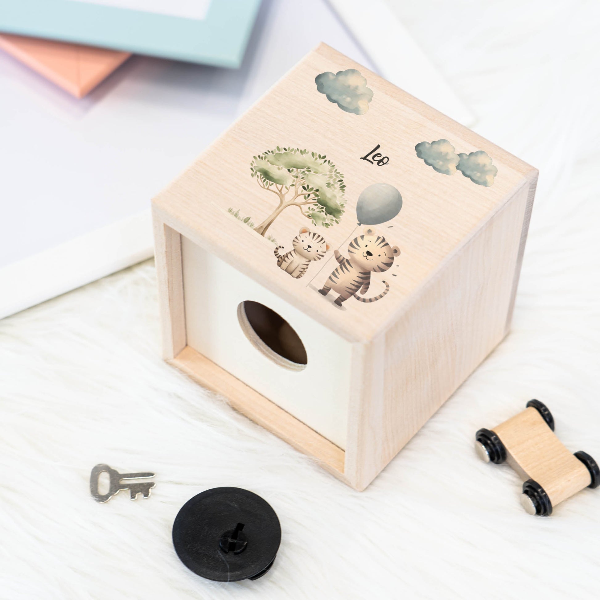 Begib dich auf ein aufregendes Safari-Abenteuer mit unserer entzückenden “ Zwei Tiger mit Luftballon auf Safari “ Holz-Spardose! Diese liebevoll gestaltete Spardose ist nicht nur ein sicherer Ort, um das Taschengeld deiner Kleinen aufzubewahren, sondern auch ein bezauberndes Accessoire, das jedes Kinderzimmer mit Abenteuerlust erfüllt.