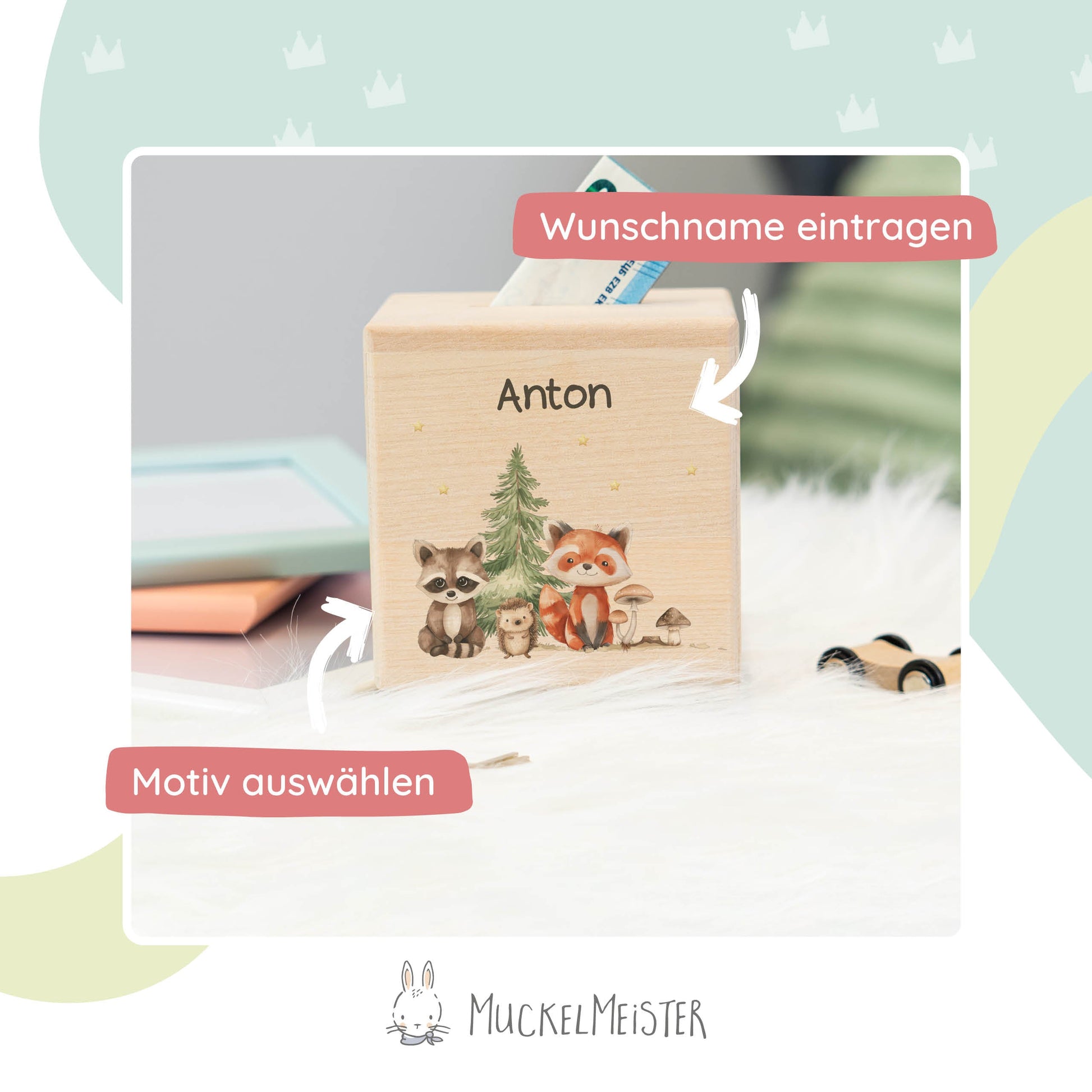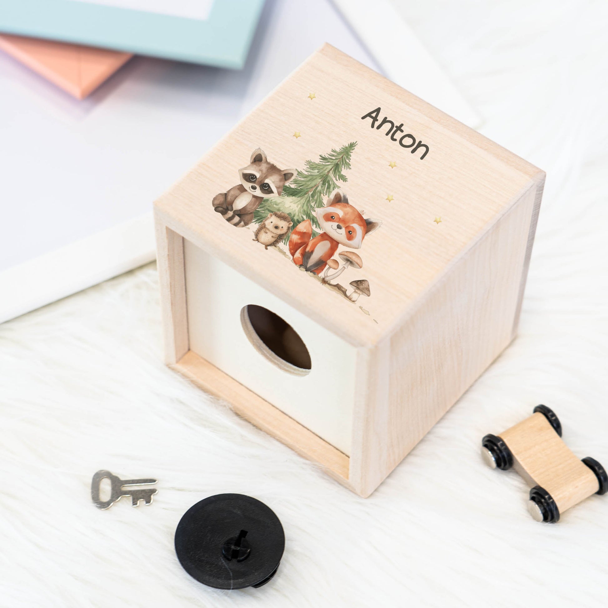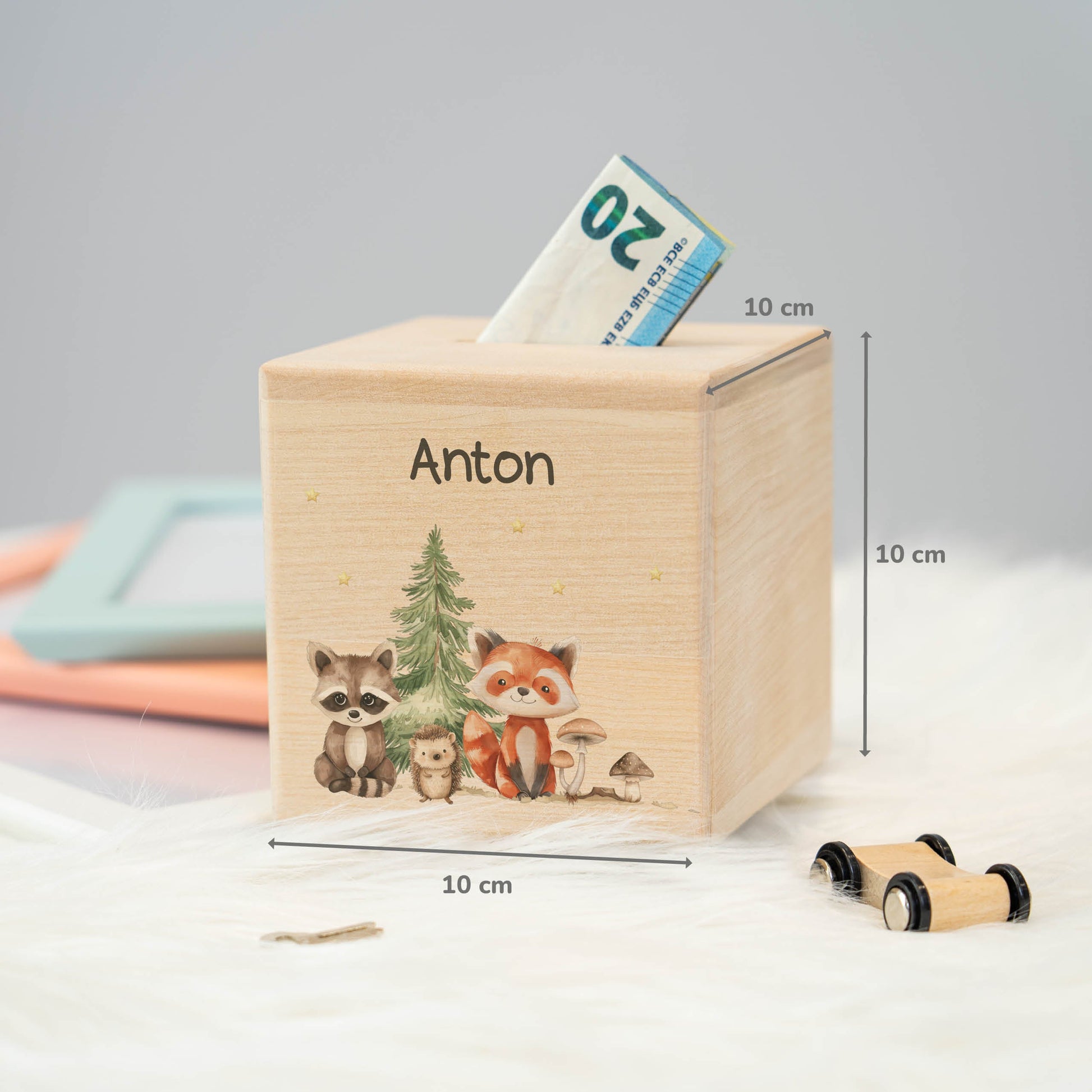 Auf der Suche nach einer originellen Spardose für Kinder? Unsere 10x10x10cm große Spardose aus Holz mit einem tierischen Waldmotiv ist die ideale Wahl! Diese liebevoll gestaltete Spardose vereint praktischen Nutzen mit einem Hauch von Abenteuer und Fantasie.