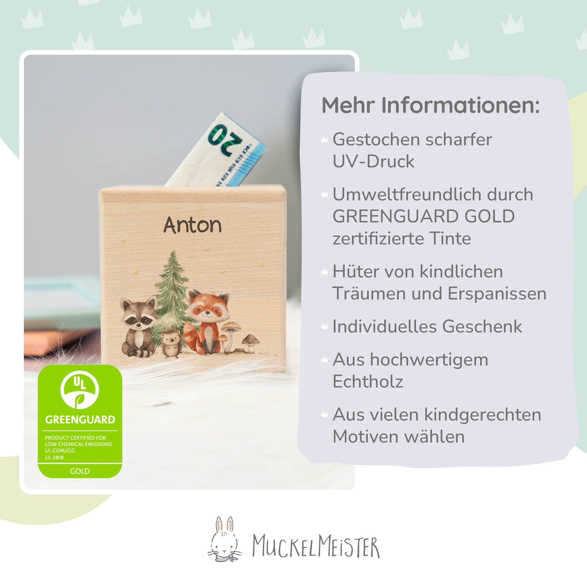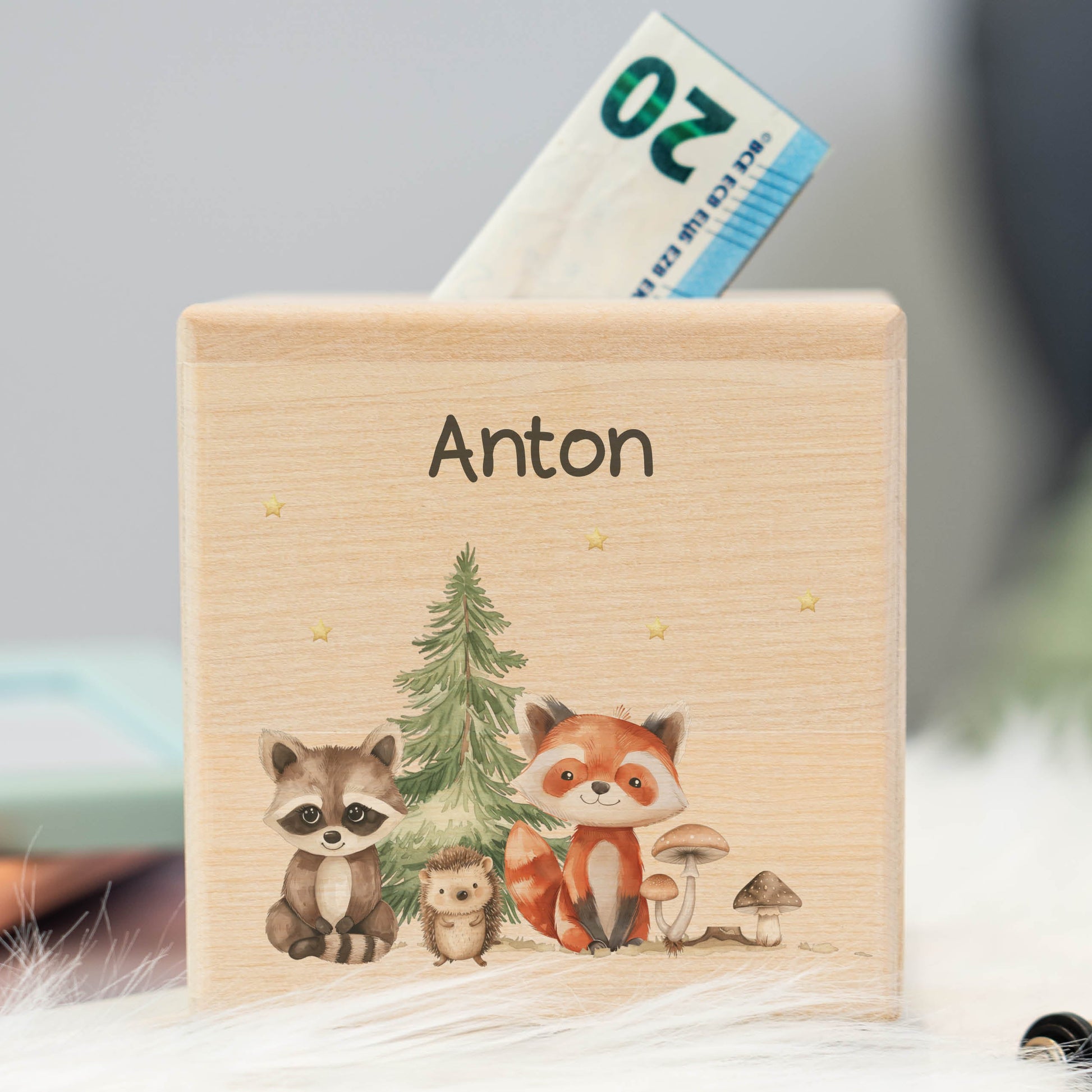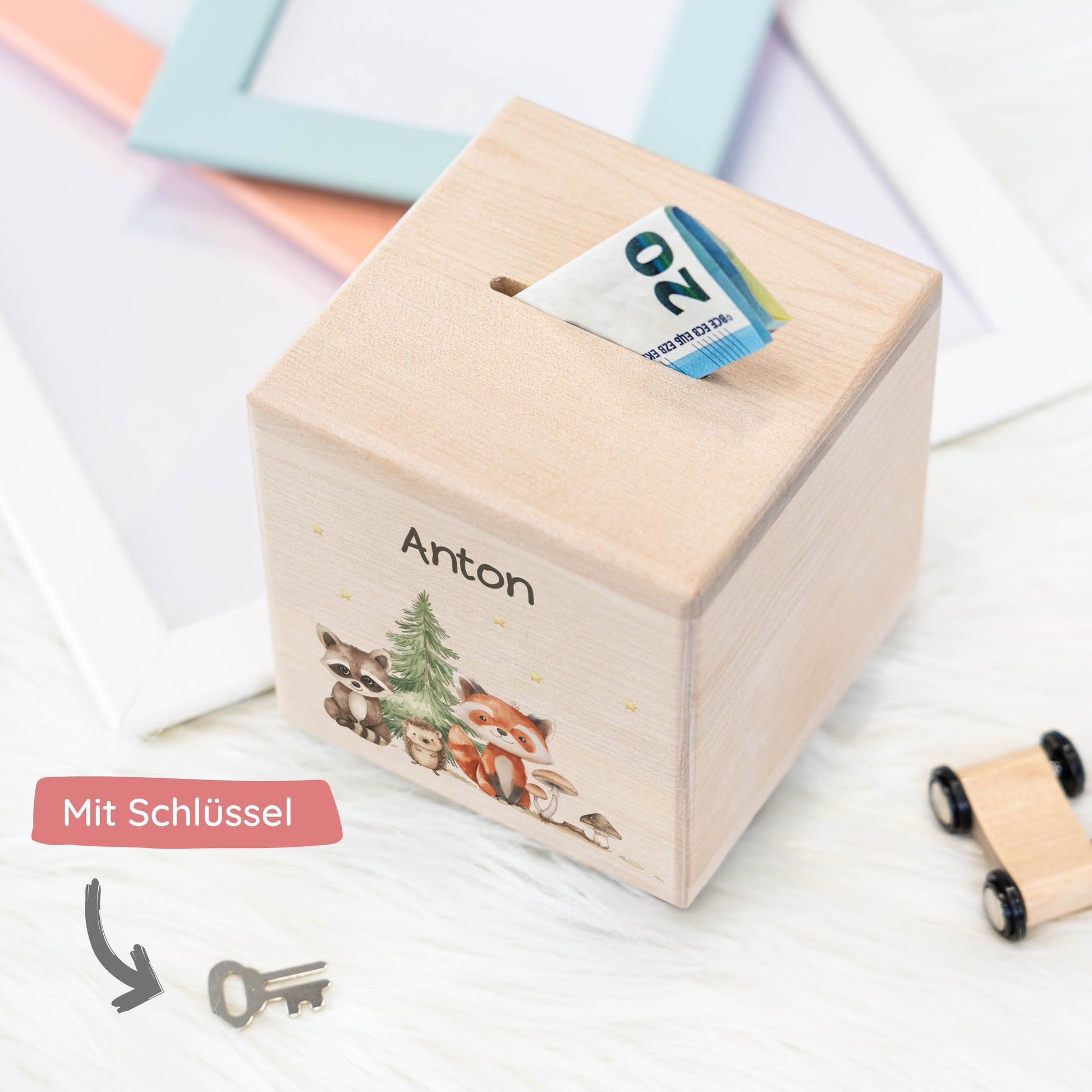 Auf der Suche nach einer originellen Spardose für Kinder? Unsere 10x10x10cm große Spardose aus Holz mit einem tierischen Waldmotiv ist die ideale Wahl! Diese liebevoll gestaltete Spardose vereint praktischen Nutzen mit einem Hauch von Abenteuer und Fantasie.