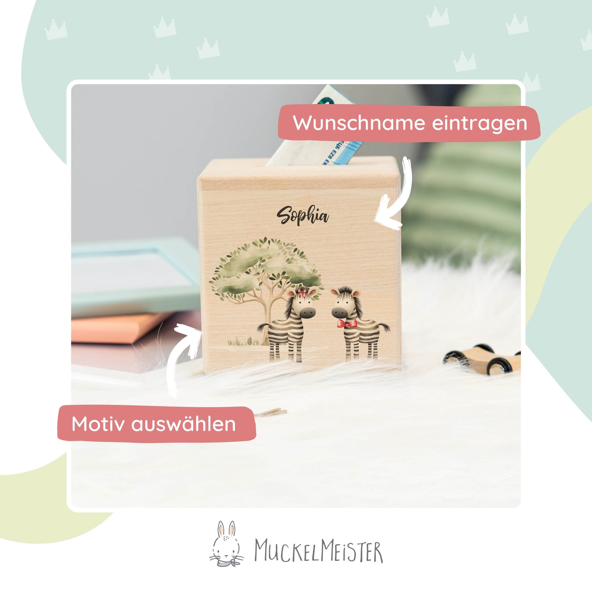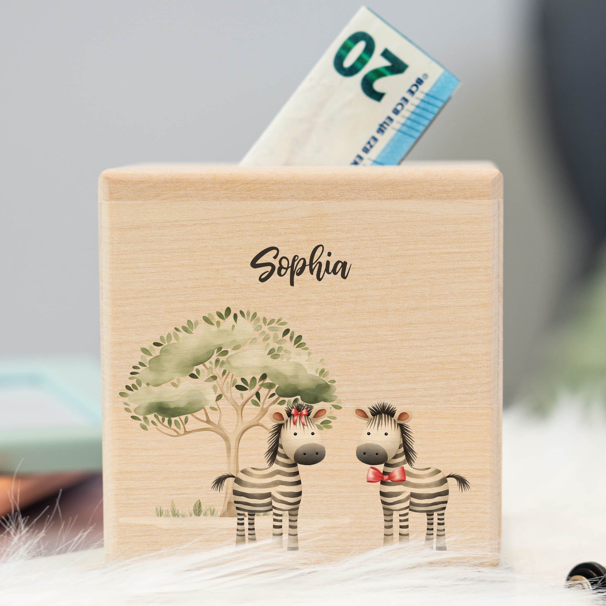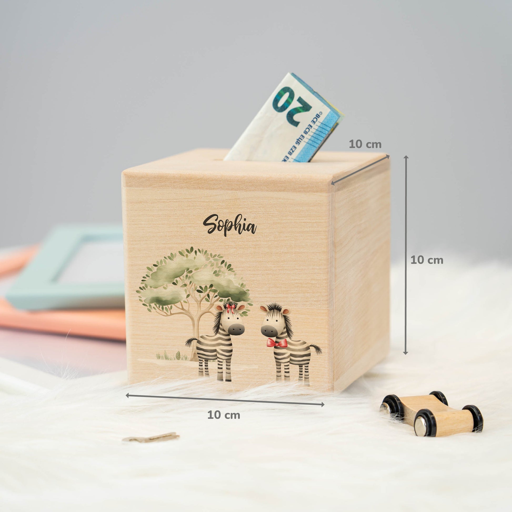 Begib dich auf eine aufregende Safari mit unseren bezaubernden “ Zwei Zebras auf Safari “ Holz-Spardose! Diese liebevoll gestaltete Spardose ist nicht nur ein sicherer Ort, um das Taschengeld deiner Kleinen aufzubewahren, sondern auch ein zauberhaftes Accessoire, das jedes Kinderzimmer mit Abenteuerlust erfüllt.