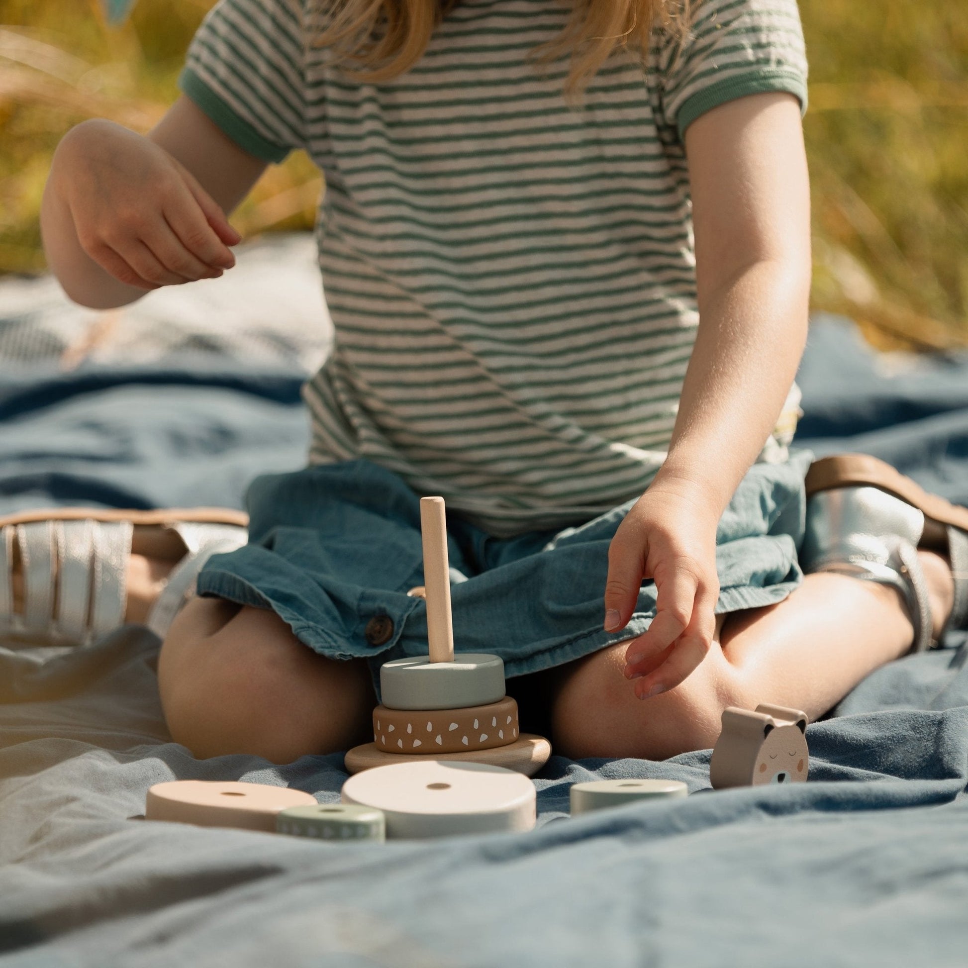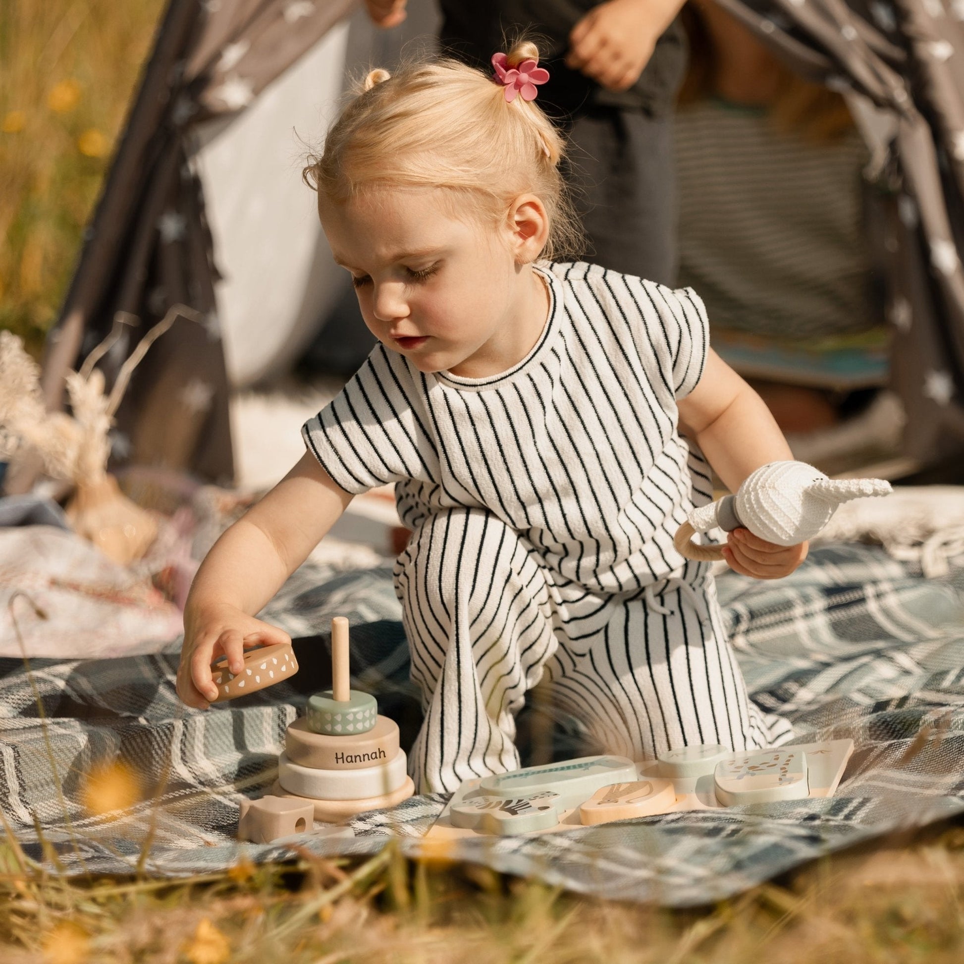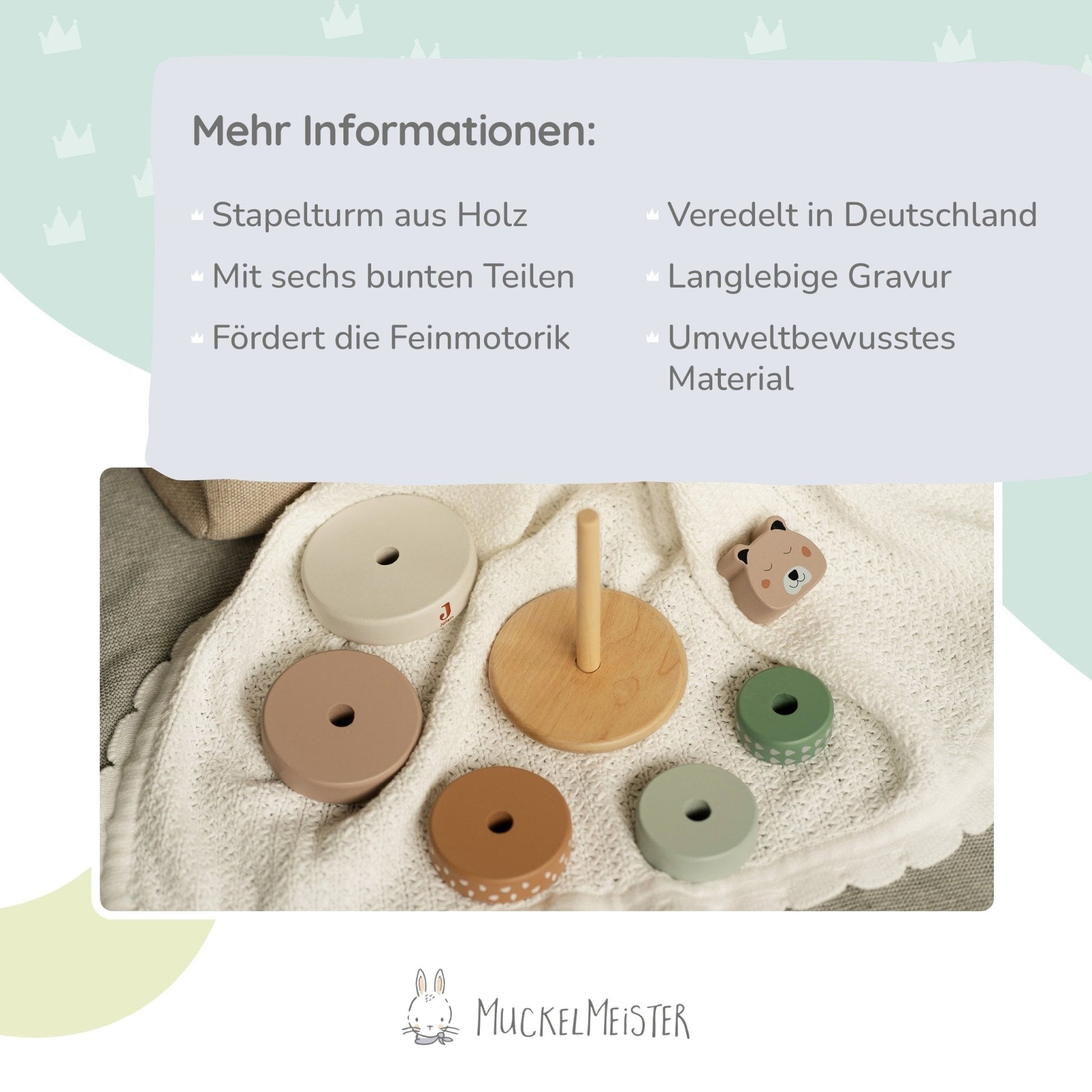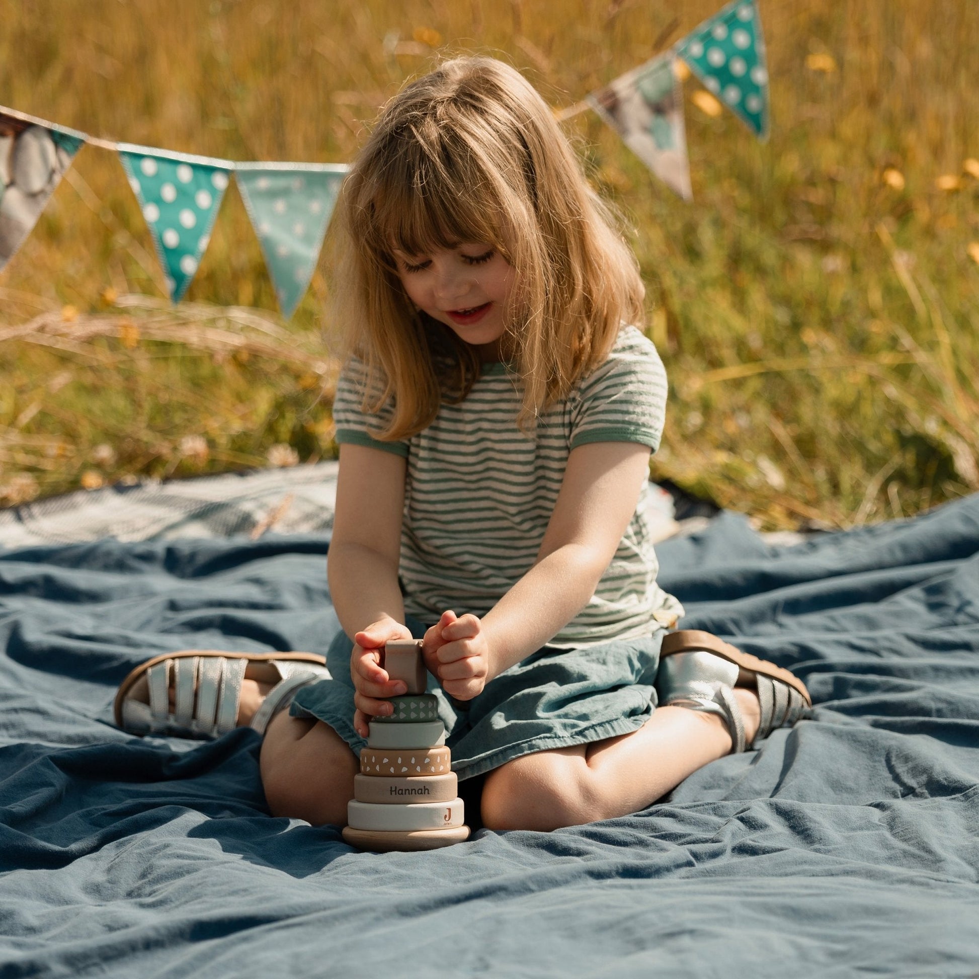 Die Formen sind so gestaltet, dass kleine HĂ€nde sie gut greifen können. Jeder Ring passt auf den nĂ€chsten â und durch die Gravur mit dem Wunschnamen wird aus dem Turm ein persönliches StĂŒck Kindheitserinnerung.