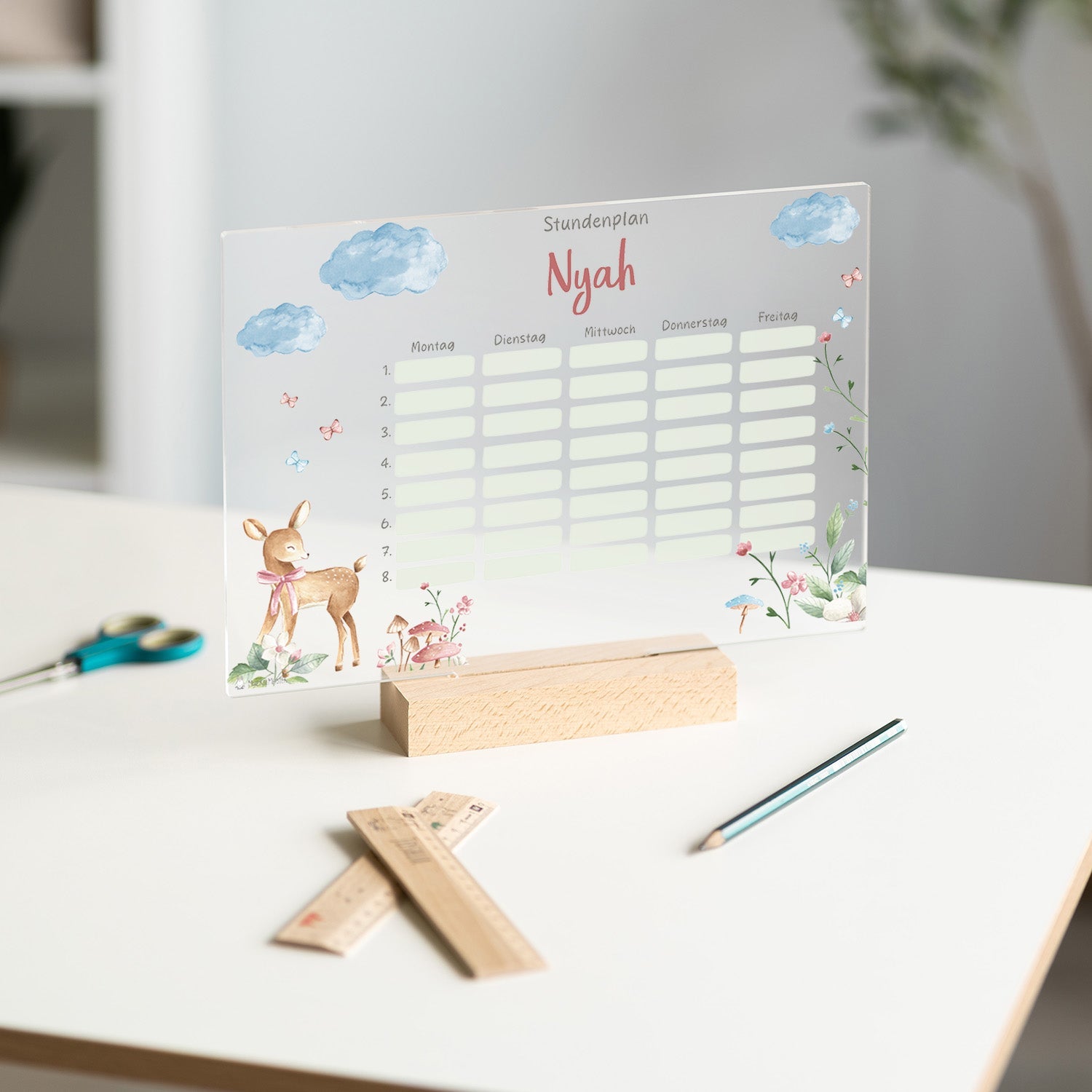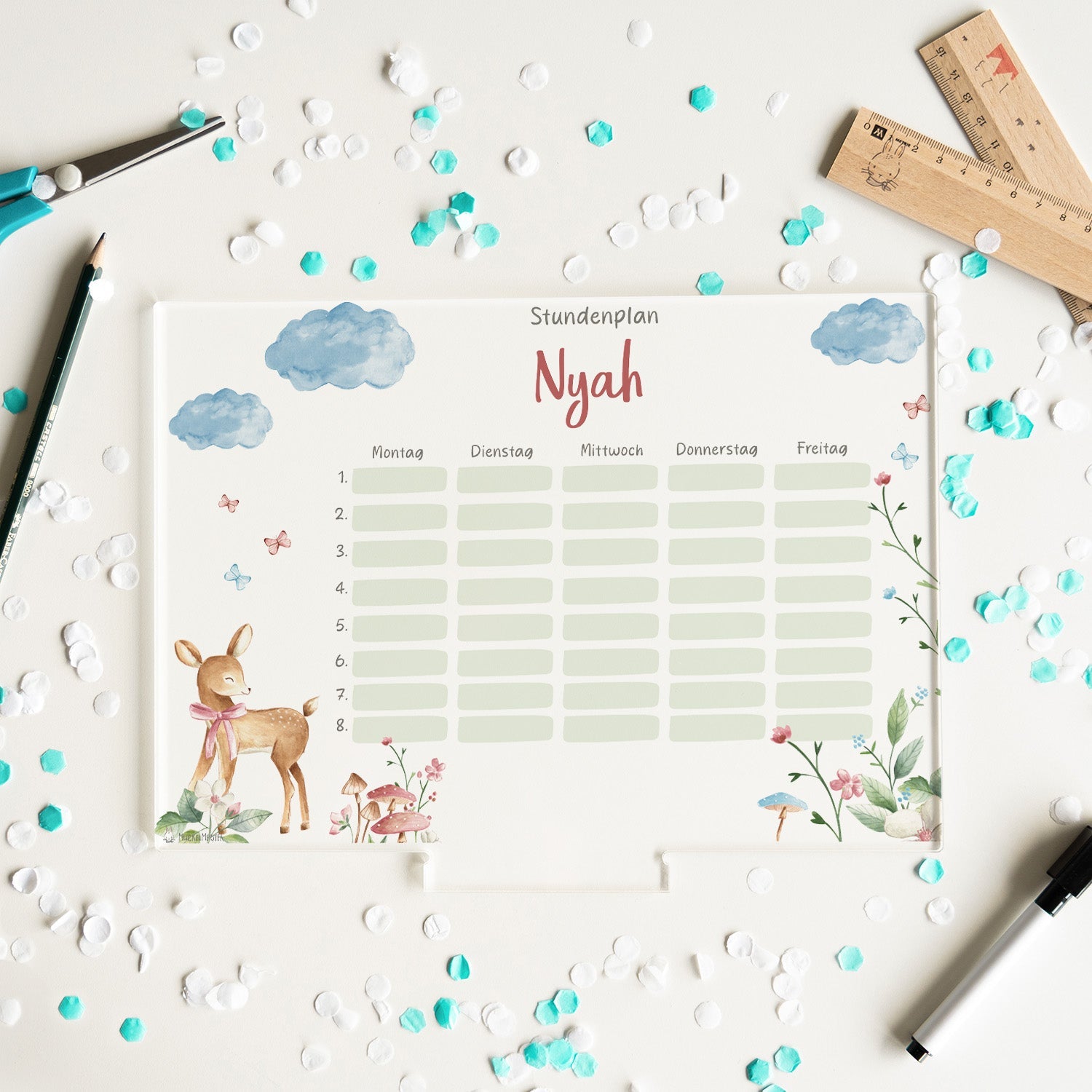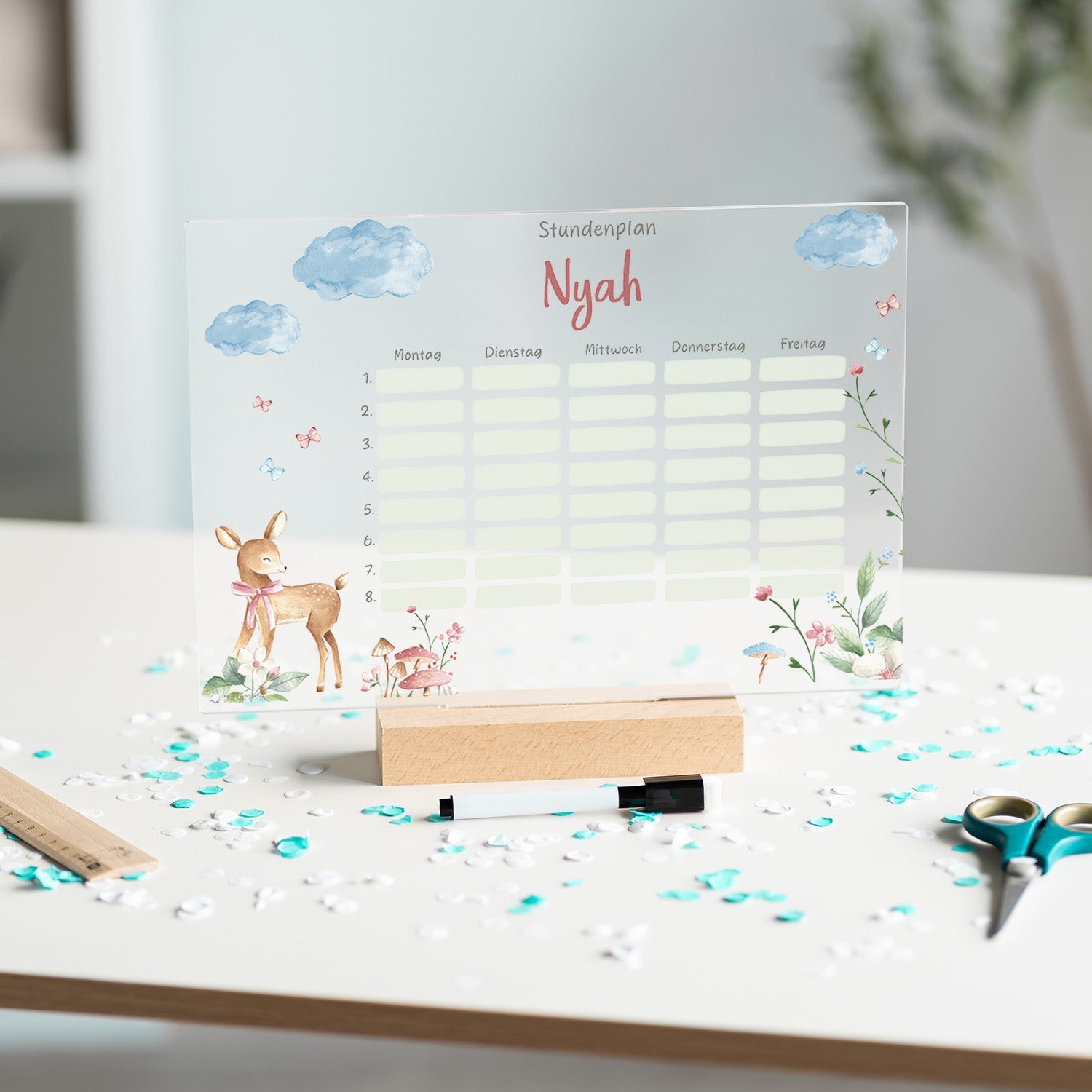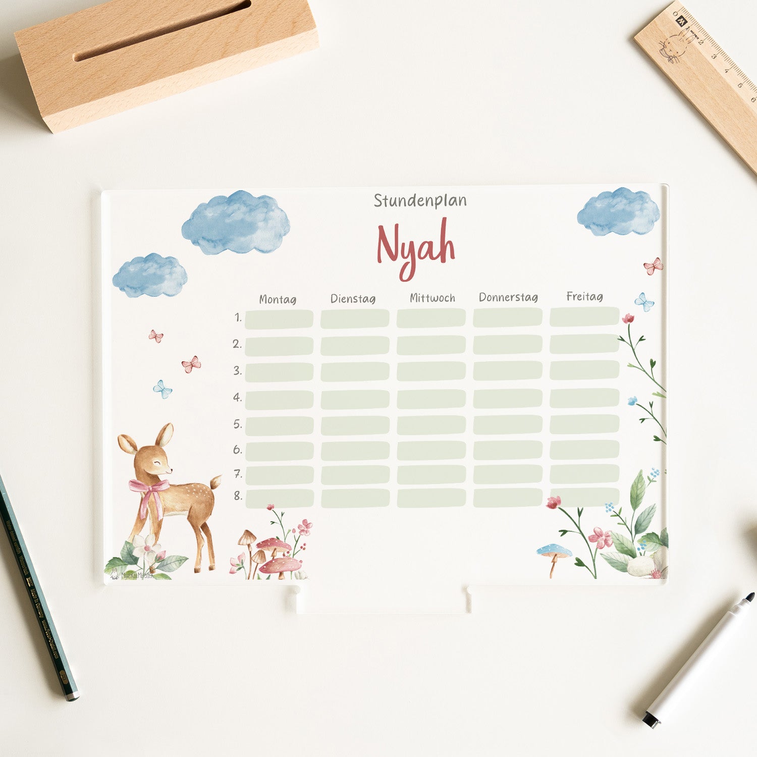 Unser abwischbarer Stundenplan aus Acryl im Reh Design ist nicht nur eine praktische Organisationshilfe, sondern auch ein dekoratives Highlight für das Kinderzimmer oder den Schreibtisch. Er fördert die Selbstständigkeit deines Kindes und hilft, den Überblick über Schulaufgaben, Freizeitaktivitäten und wichtige Termine zu behalten.