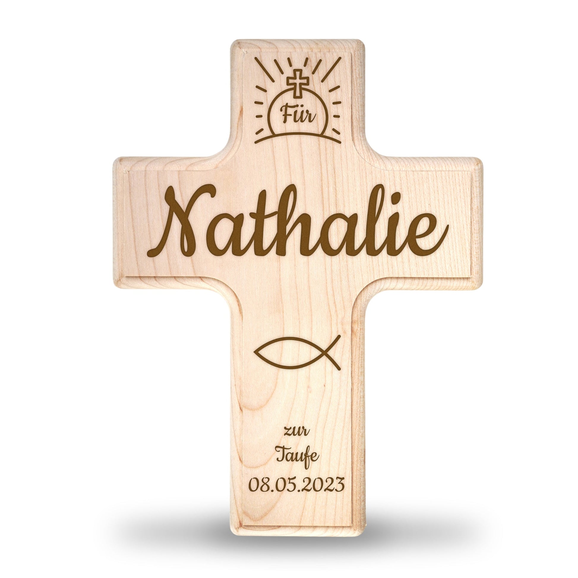 Hochwertiges Holz: Unser Kreuz besteht aus hochwertigem Ahorn und ist sorgfältig verarbeitet, um eine dauerhafte und schöne Erinnerung an die Taufe zu schaffen.