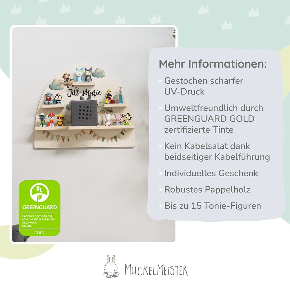 Hochwertiges Holz: Das Regal besteht aus robustem und langlebigem Holz, das eine sichere und stabile Aufbewahrungslösung für die Tonie-Figuren deines Kindes bietet. Das natürliche Material ist umweltfreundlich und passt perfekt in jedes Kinderzimmer.